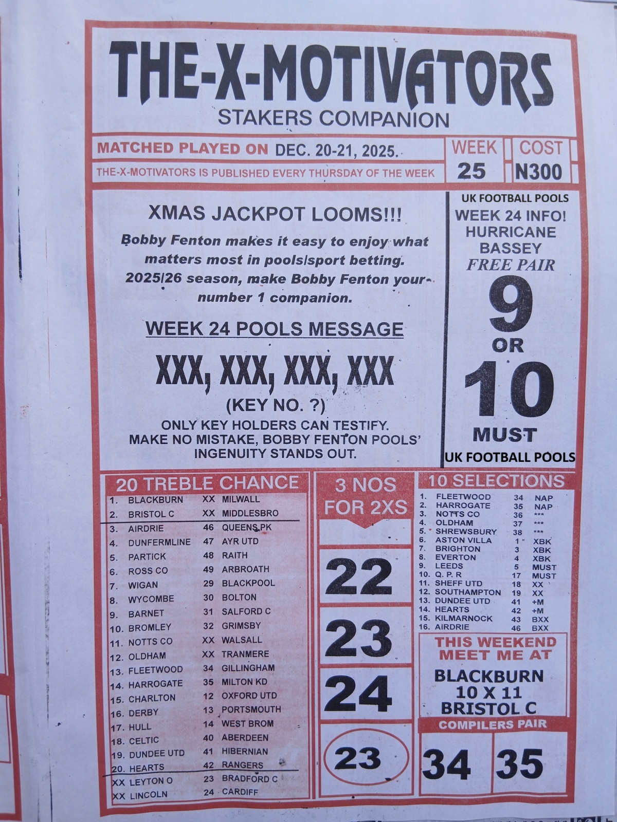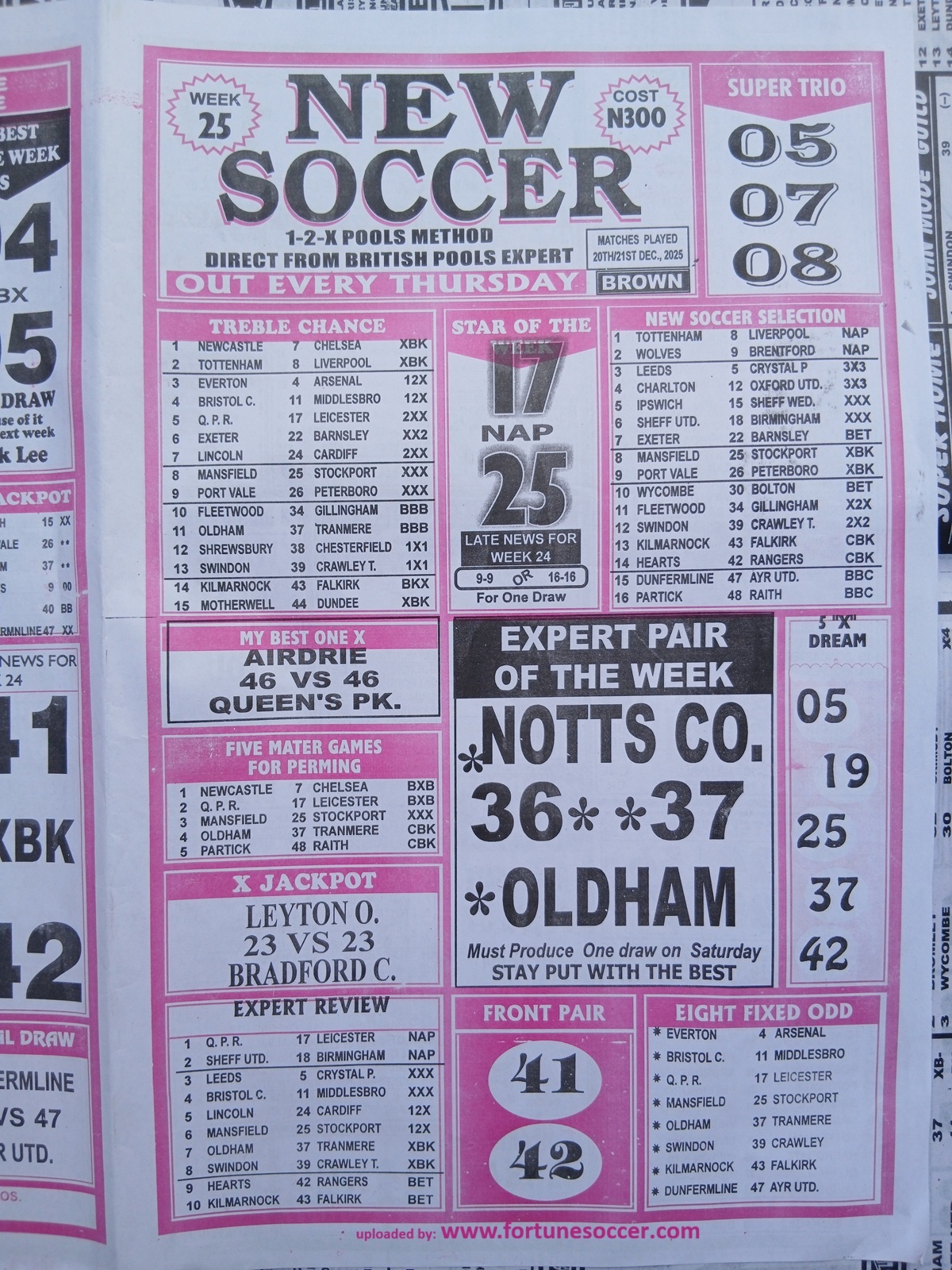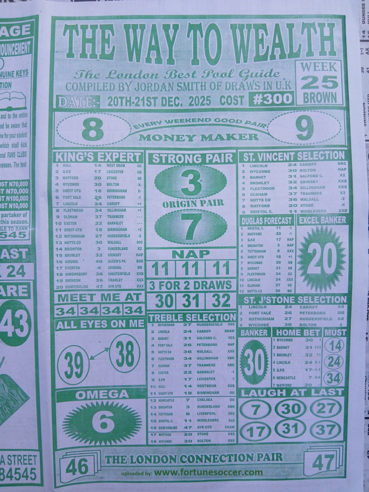 Our weekly publication of week 25 pools papers includes the following but no limited to: New soccer, liberty pools international, the way to wealth, 1.2.x weekly winners, the-x-motivators, premier soccer, cherry mansfield, the great soccer and many more football pools papers to follow in subsequent editions.