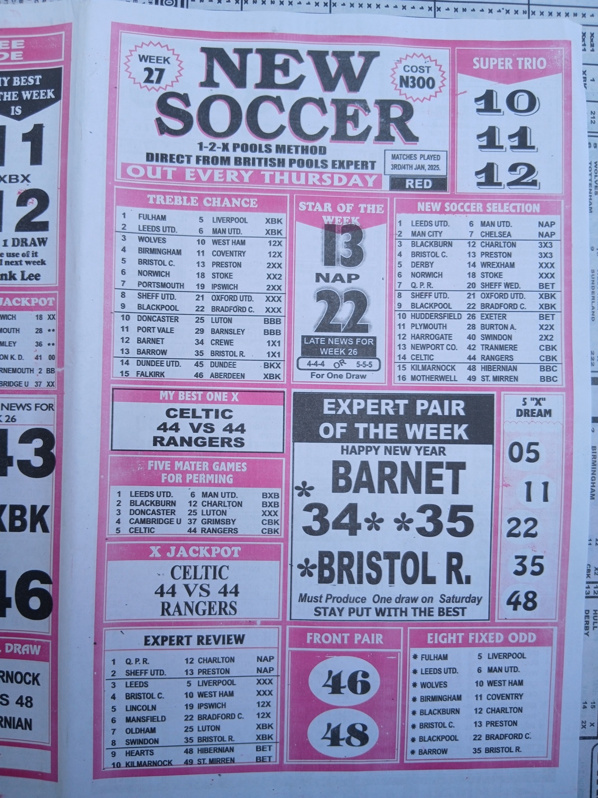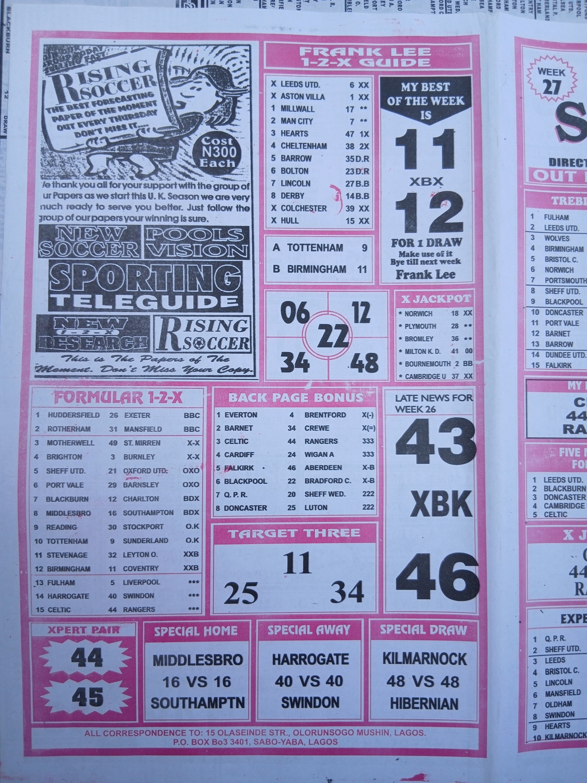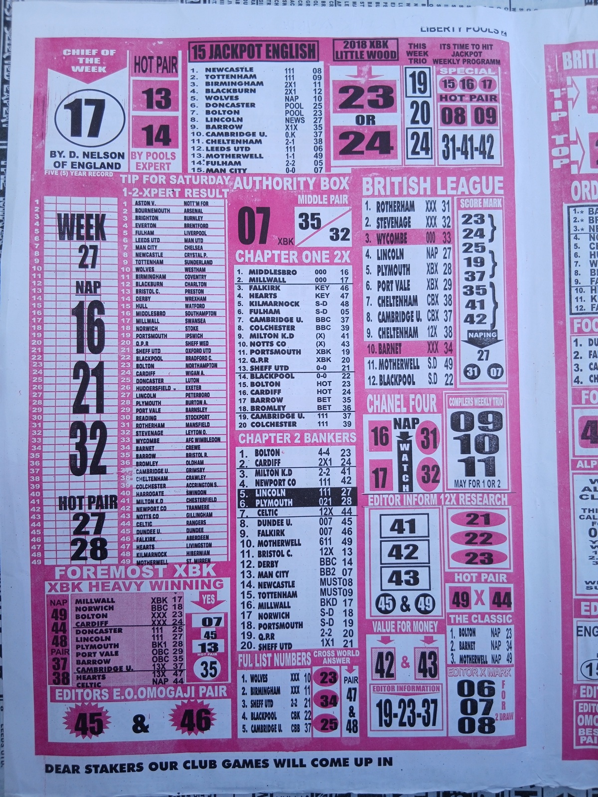 Our weekly publication of week 27 pools papers includes the following but no limited to: New soccer, liberty pools international, the way to wealth, 1.2.x weekly winners, the-x-motivators, premier soccer, cherry mansfield, the great soccer and many more football pools papers to follow in subsequent editions.