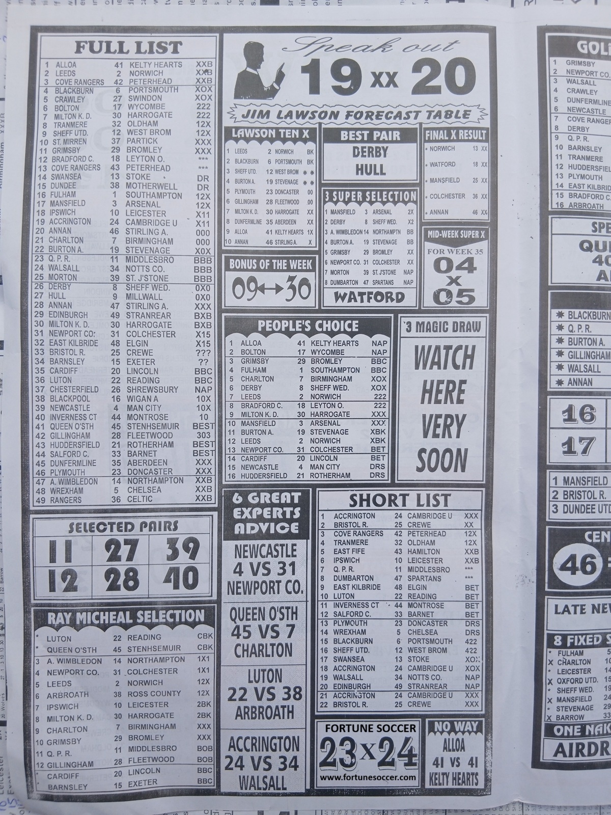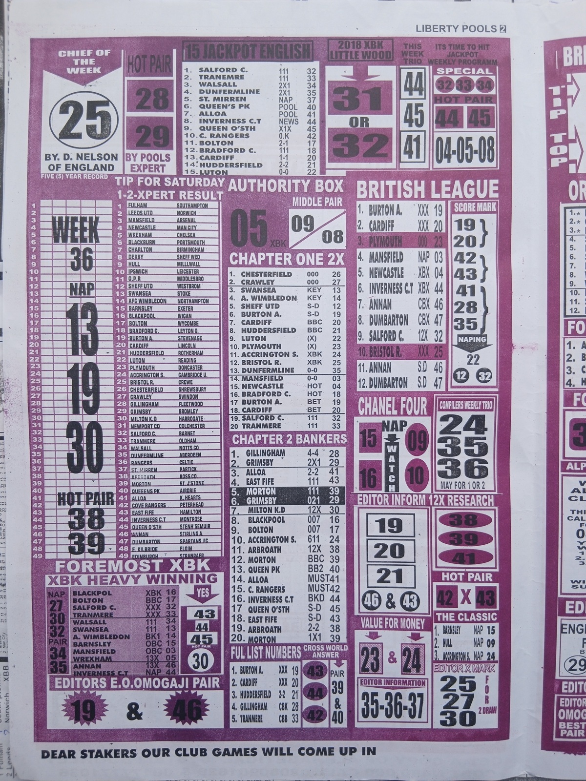 Our weekly publication of week 36 pools papers includes the following but no limited to: New soccer, liberty pools international, the way to wealth, 1.2.x weekly winners, the-x-motivators, premier soccer, cherry mansfield, the great soccer and many more football pools papers to follow in subsequent editions.