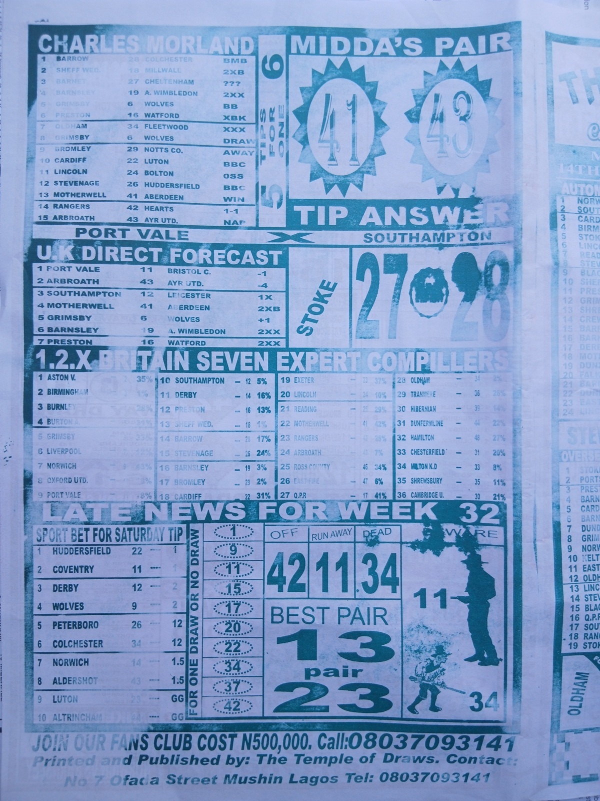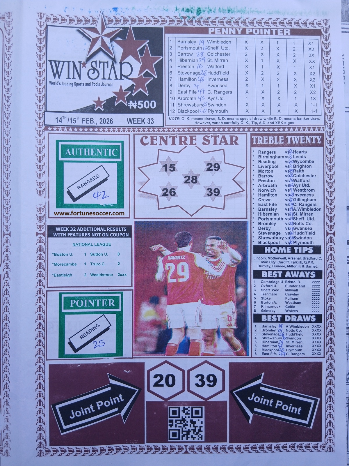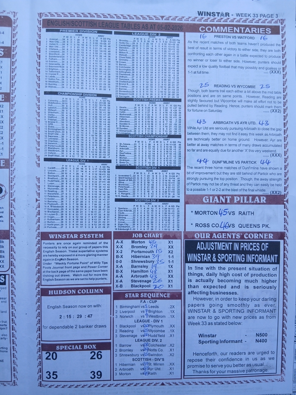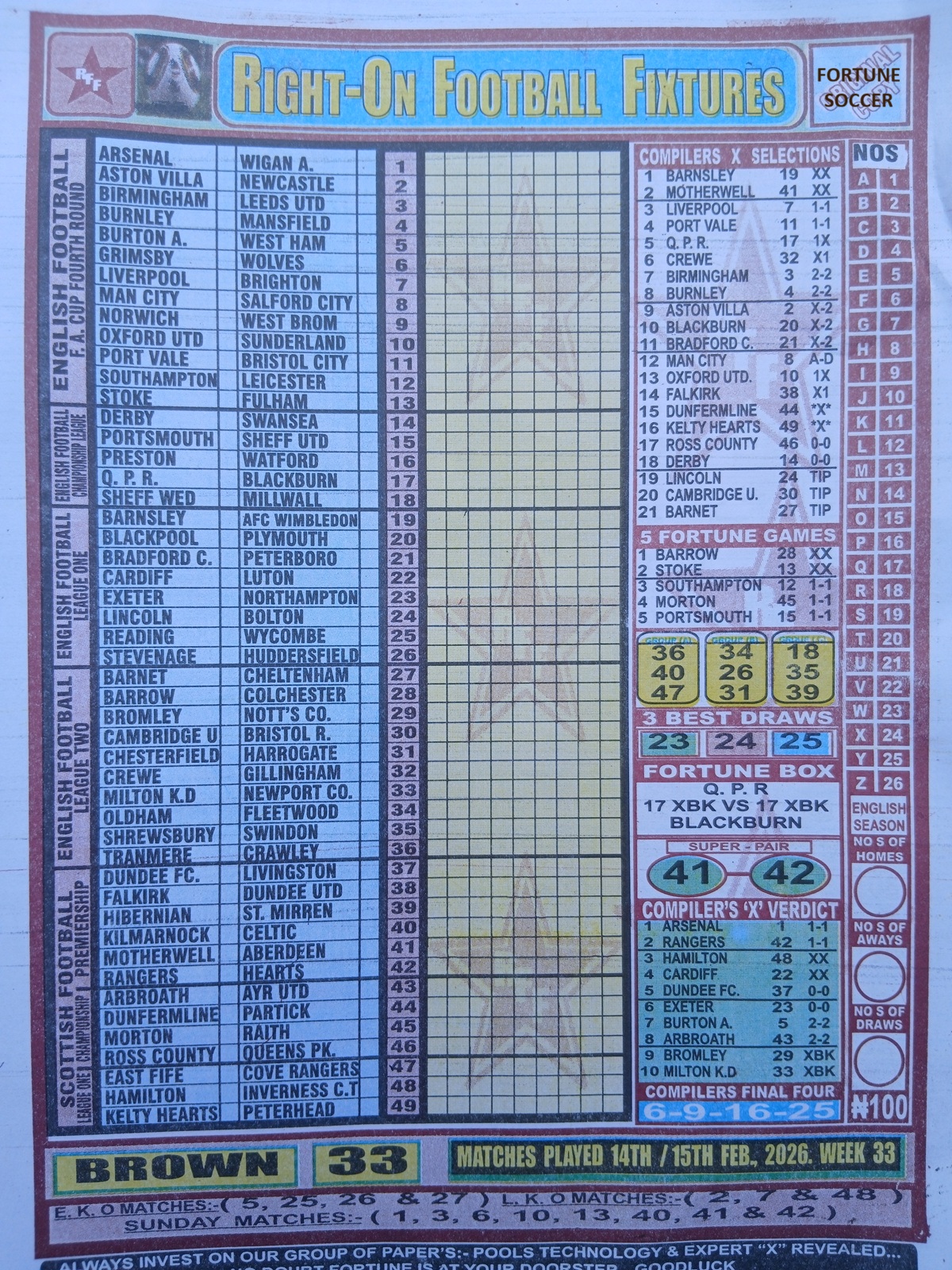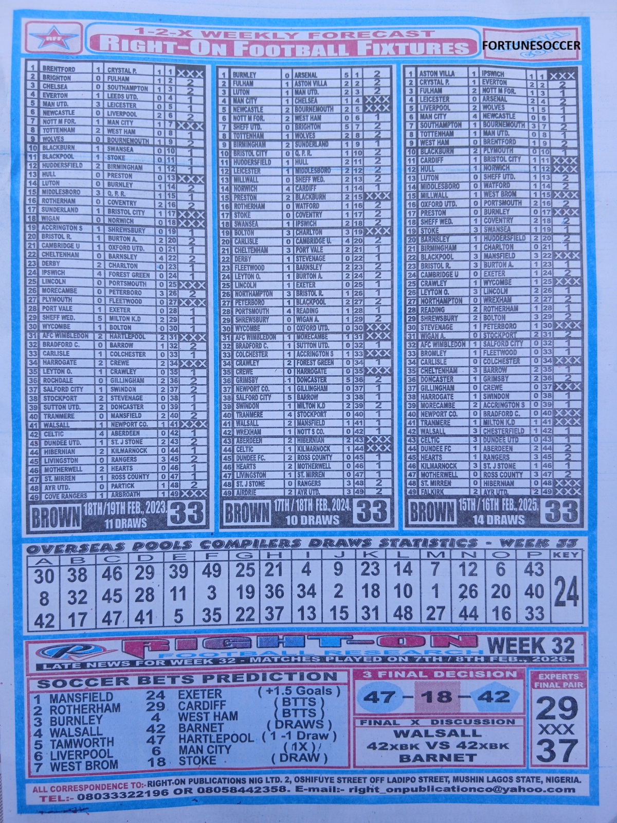 Week 33 pool late news paper 2026; Welcome to fortune soccer pool papers for this week, here we publish football pool forecasting papers, such as right on fixtures, winstar pool paper, happy joe pool paper, temple of draw pool paper, mirror punters guide international, bigwin pool paper, pools telegraph late news papers. Weekly football pool papers are updated every week 33 2026/2027 to enhance and boost your winning chances every round on the classic football pools.