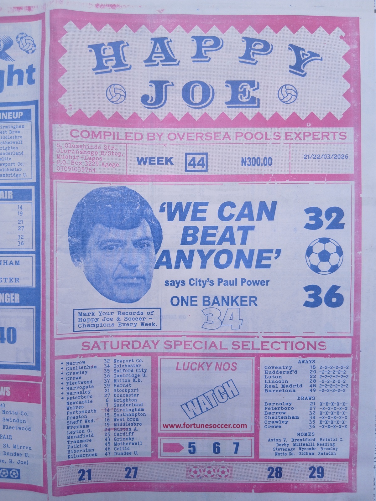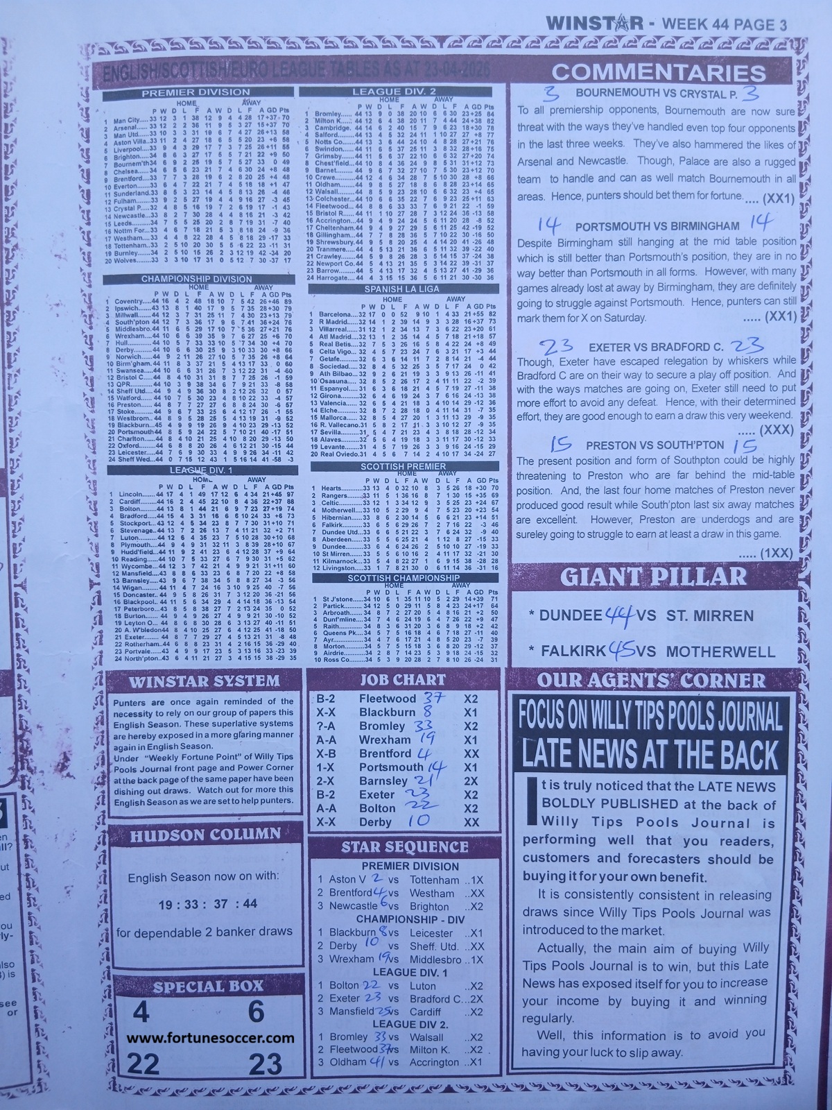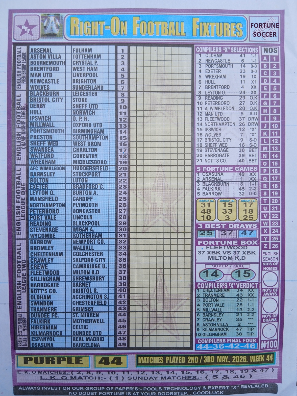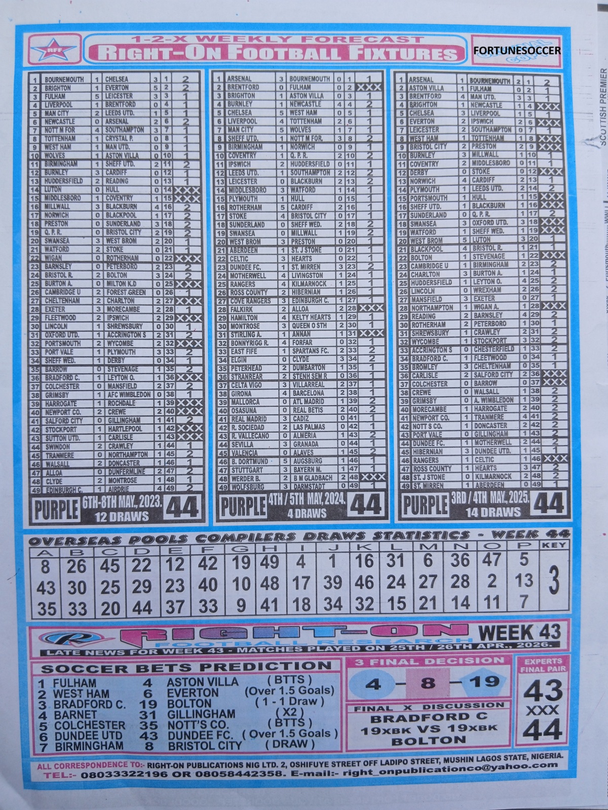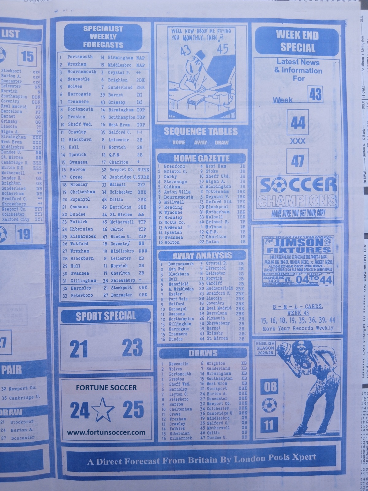 Week 44 pool late news paper 2026; Welcome to fortune soccer pool papers for this week, here we publish football pool forecasting papers, such as right on fixtures, winstar pool paper, happy joe pool paper, temple of draw pool paper, mirror punters guide international, bigwin pool paper, pools telegraph late news papers. Weekly football pool papers are updated every week 44 2026/2027 to enhance and boost your winning chances every round on the classic football pools.