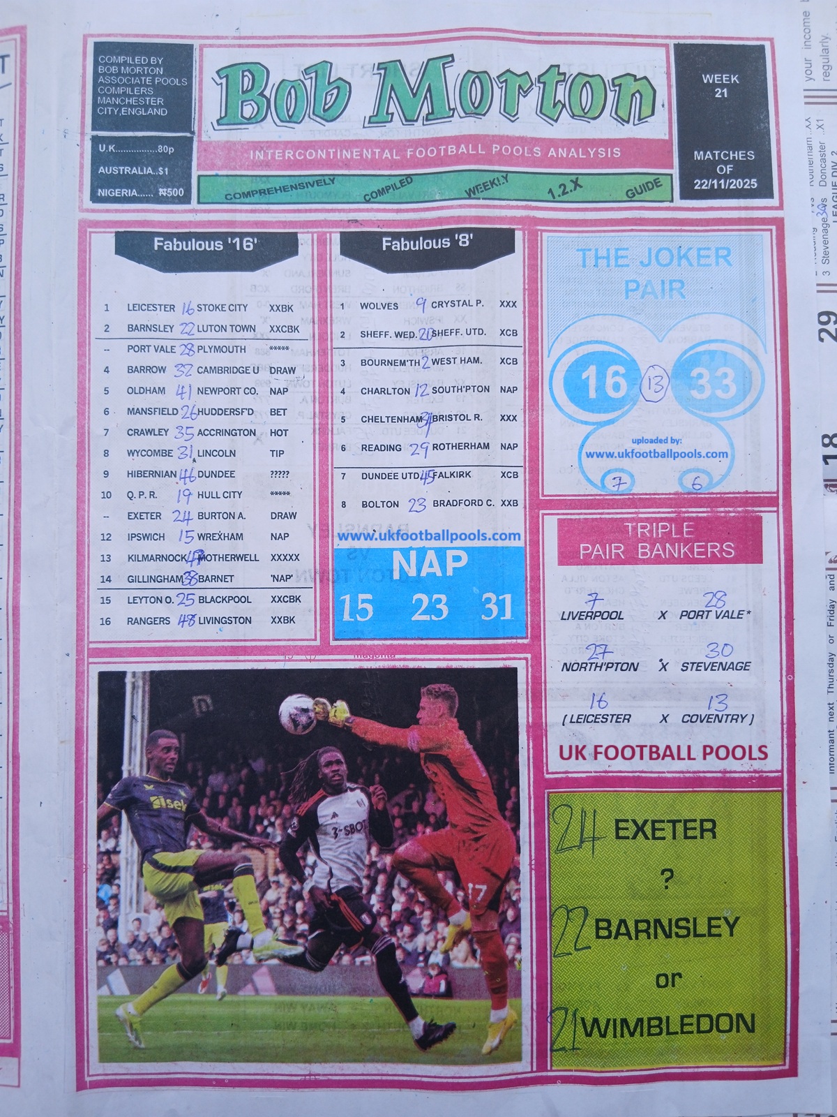 Week 21 Pool Result for Sat 22, Nov 2025, UK 2025/2026