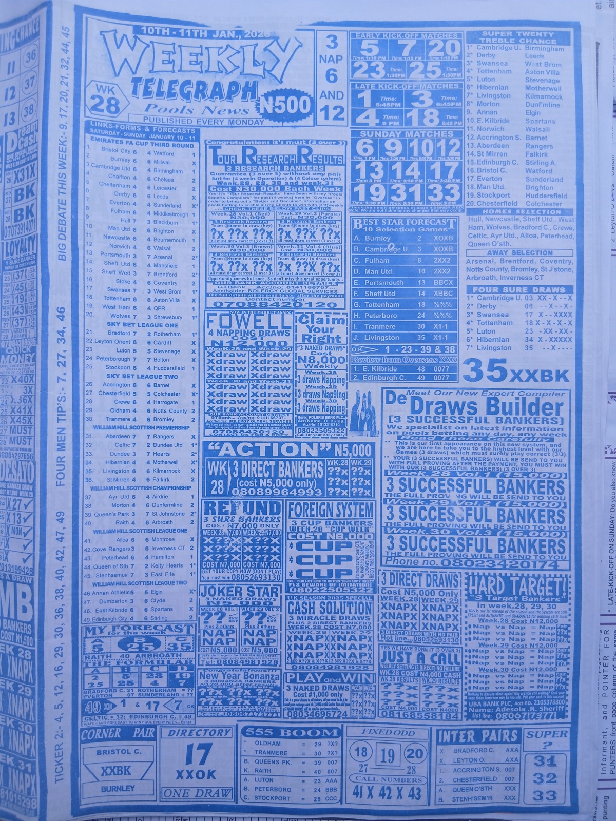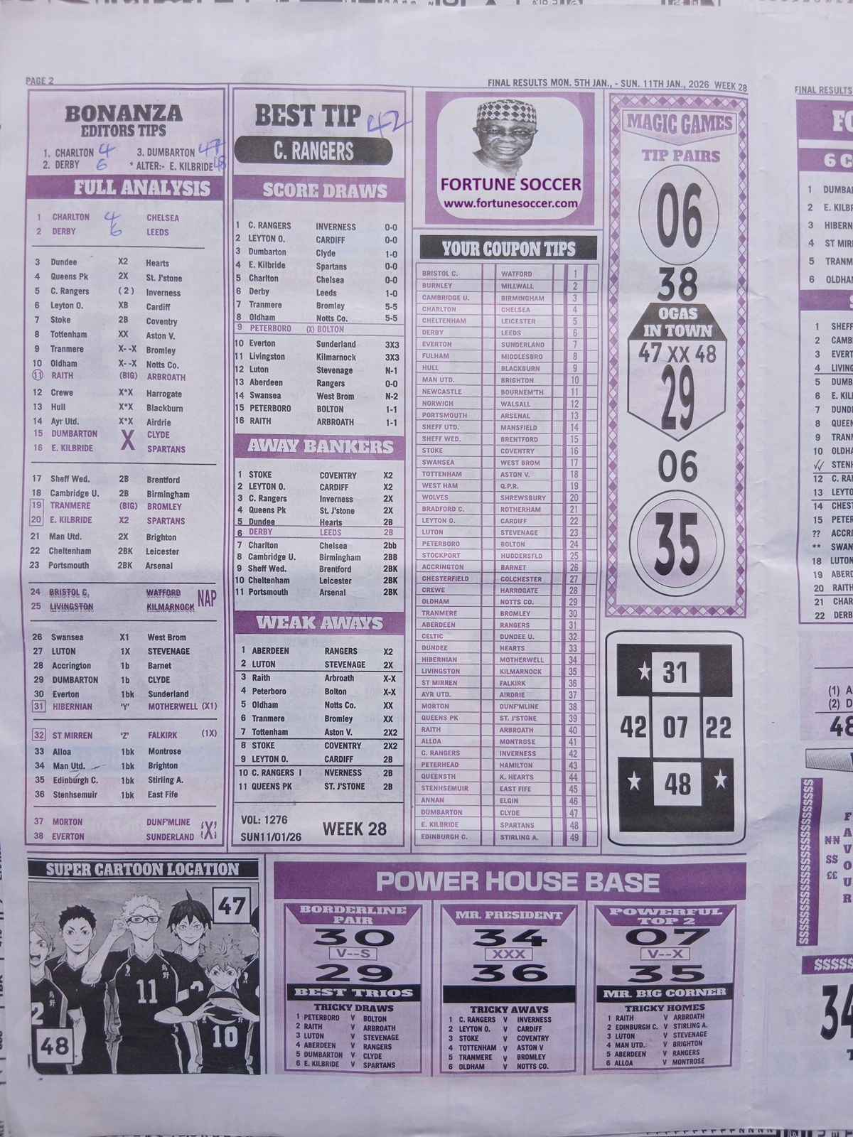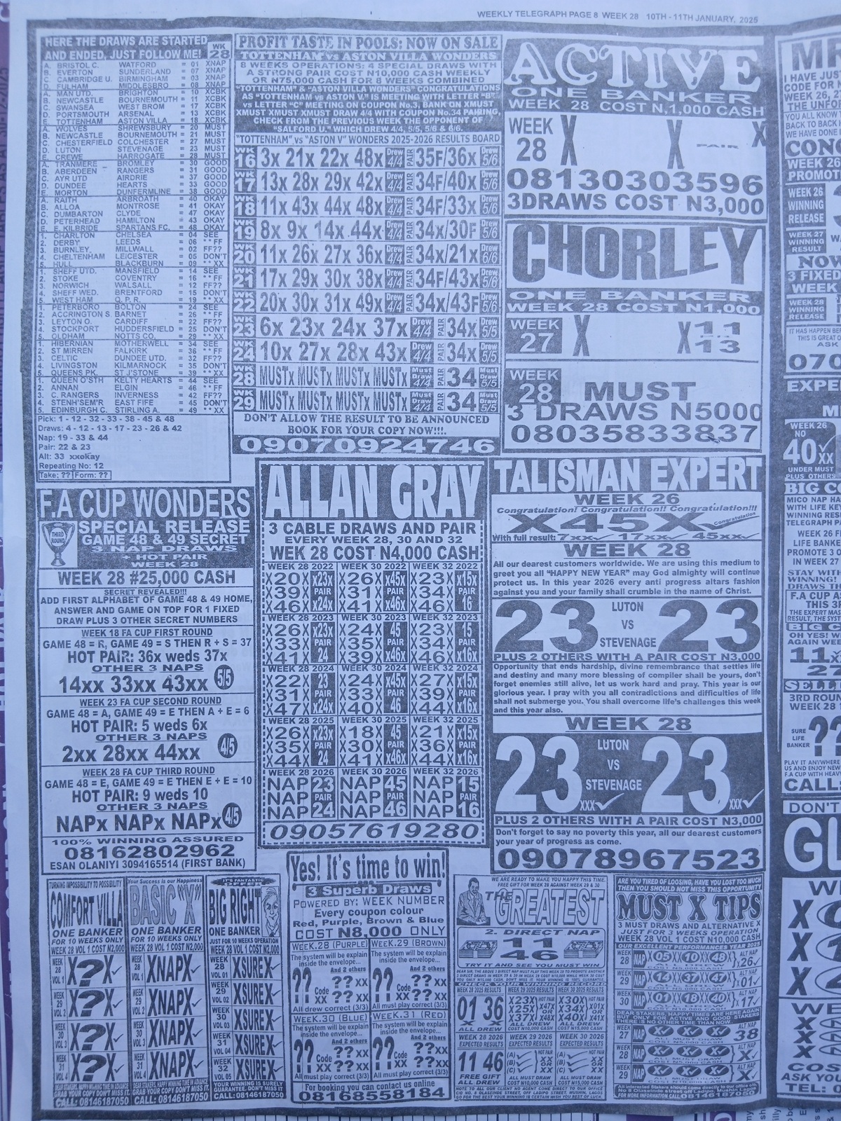 Welcome to Fortune Soccer on this section we provide other football pools forecasting papers for this week 28, such as the weekly telegraph paper, final result, the new dream late news, and other pools office forecasting papers and journals. Always refresh your browser and check back for updates inspired by pool paper association of Nigeria.