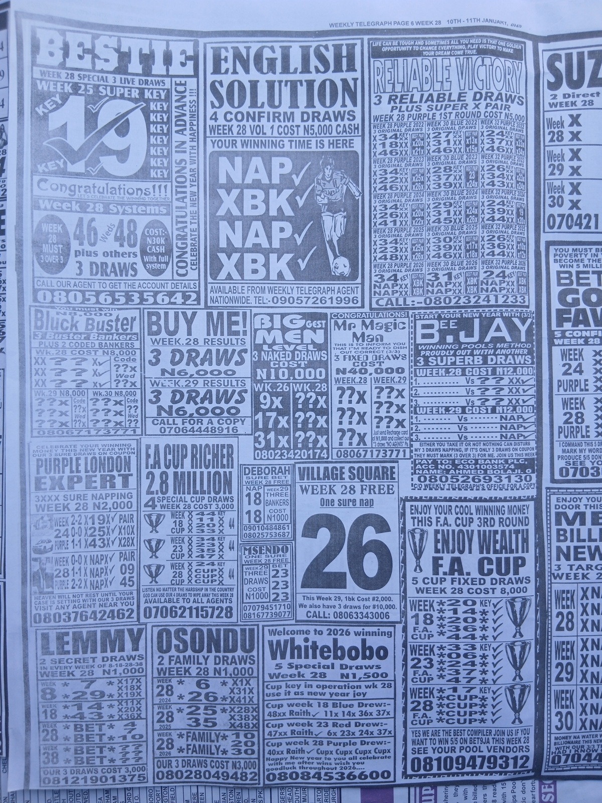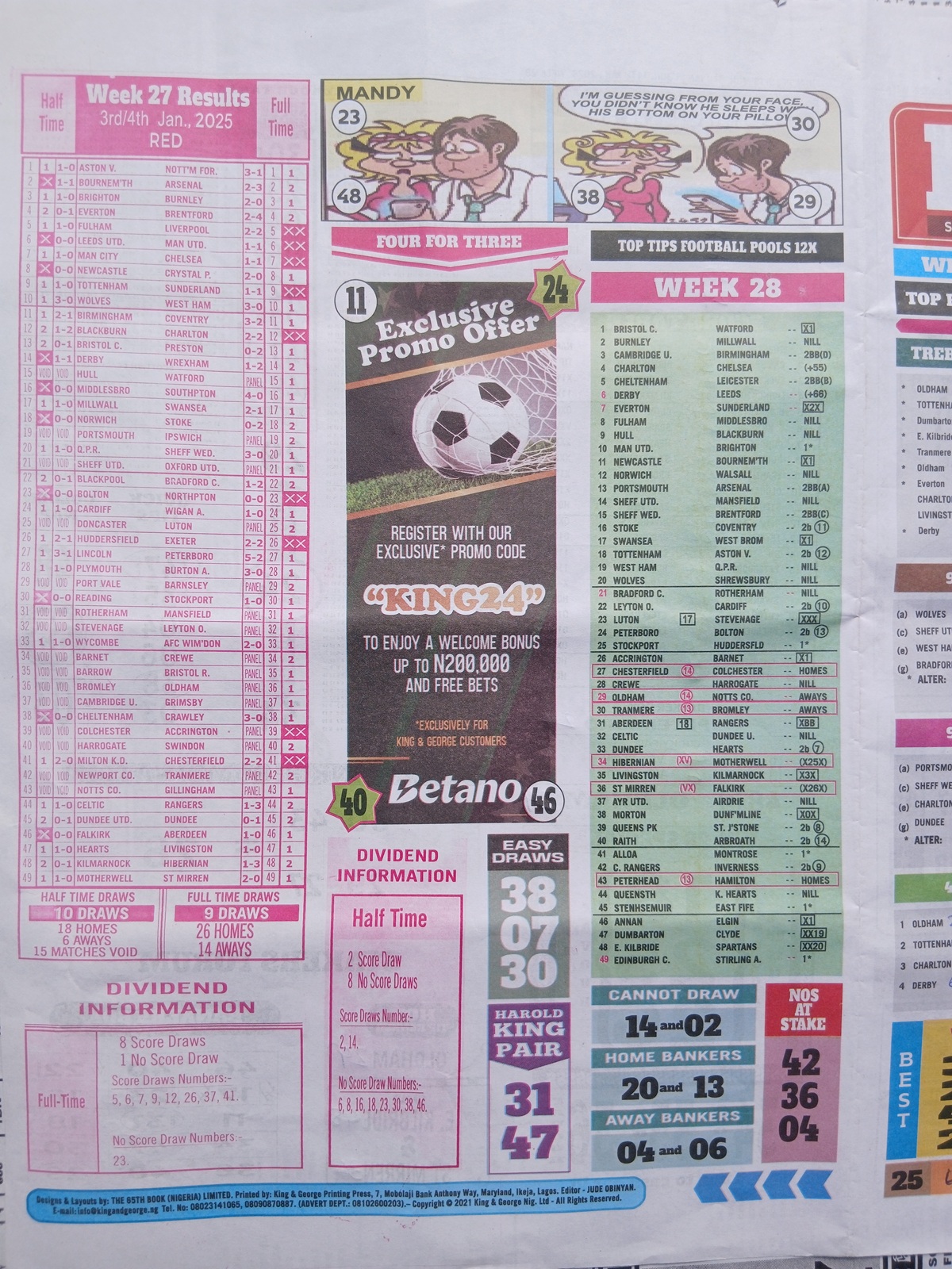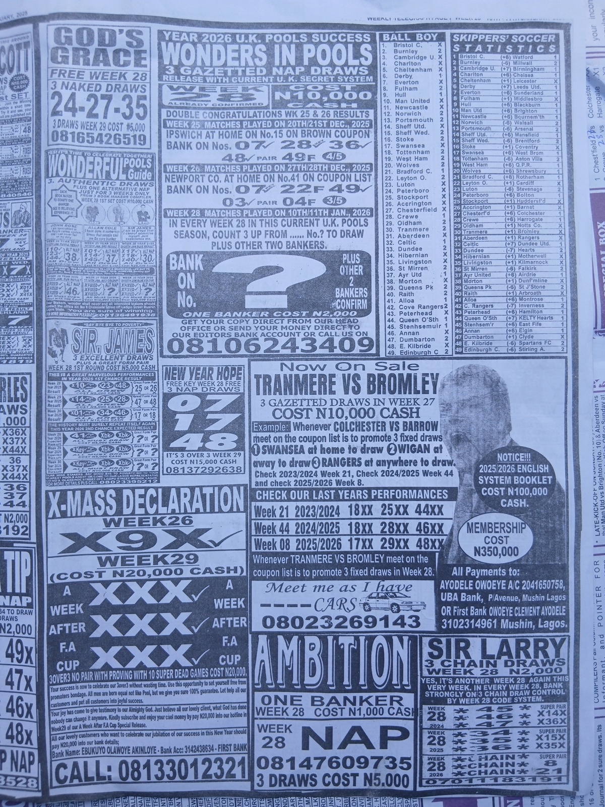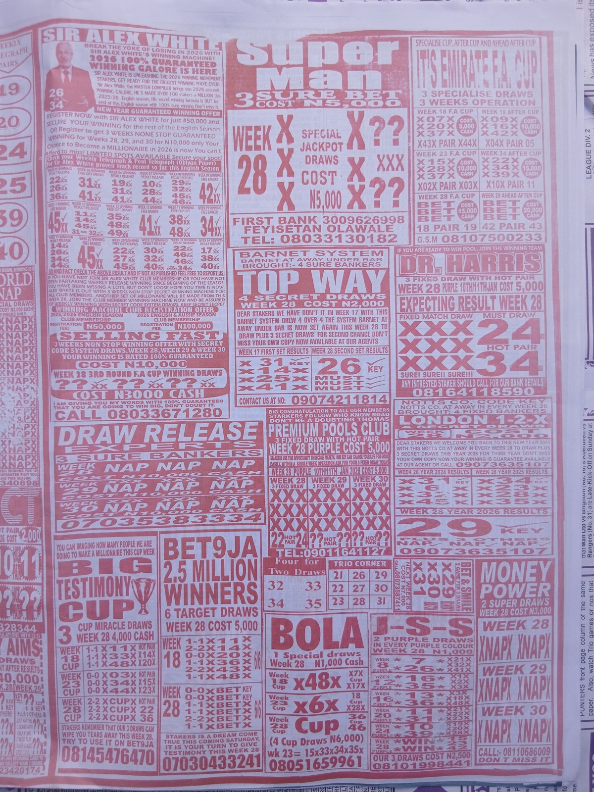 Welcome to Fortune Soccer on this section we provide other football pools forecasting papers for this week 28, such as the weekly telegraph paper, final result, the new dream late news, and other pools office forecasting papers and journals. Always refresh your browser and check back for updates inspired by pool paper association of Nigeria.