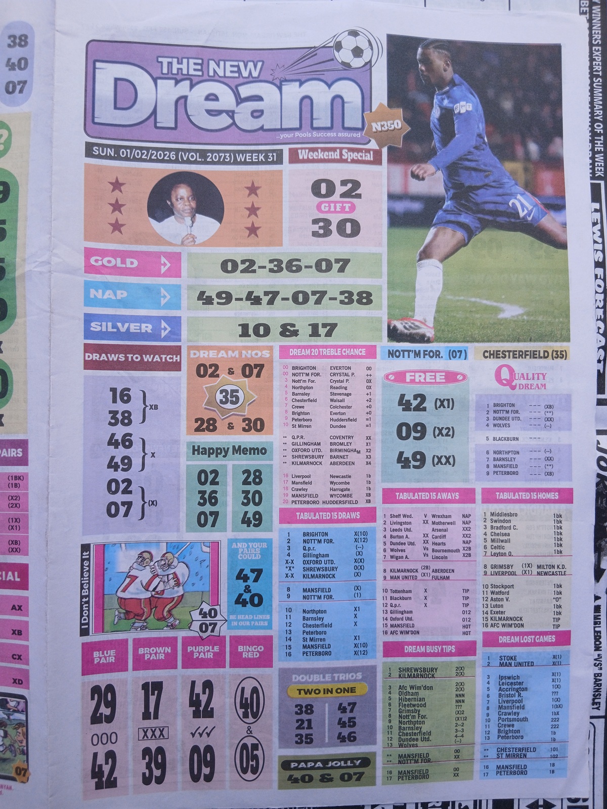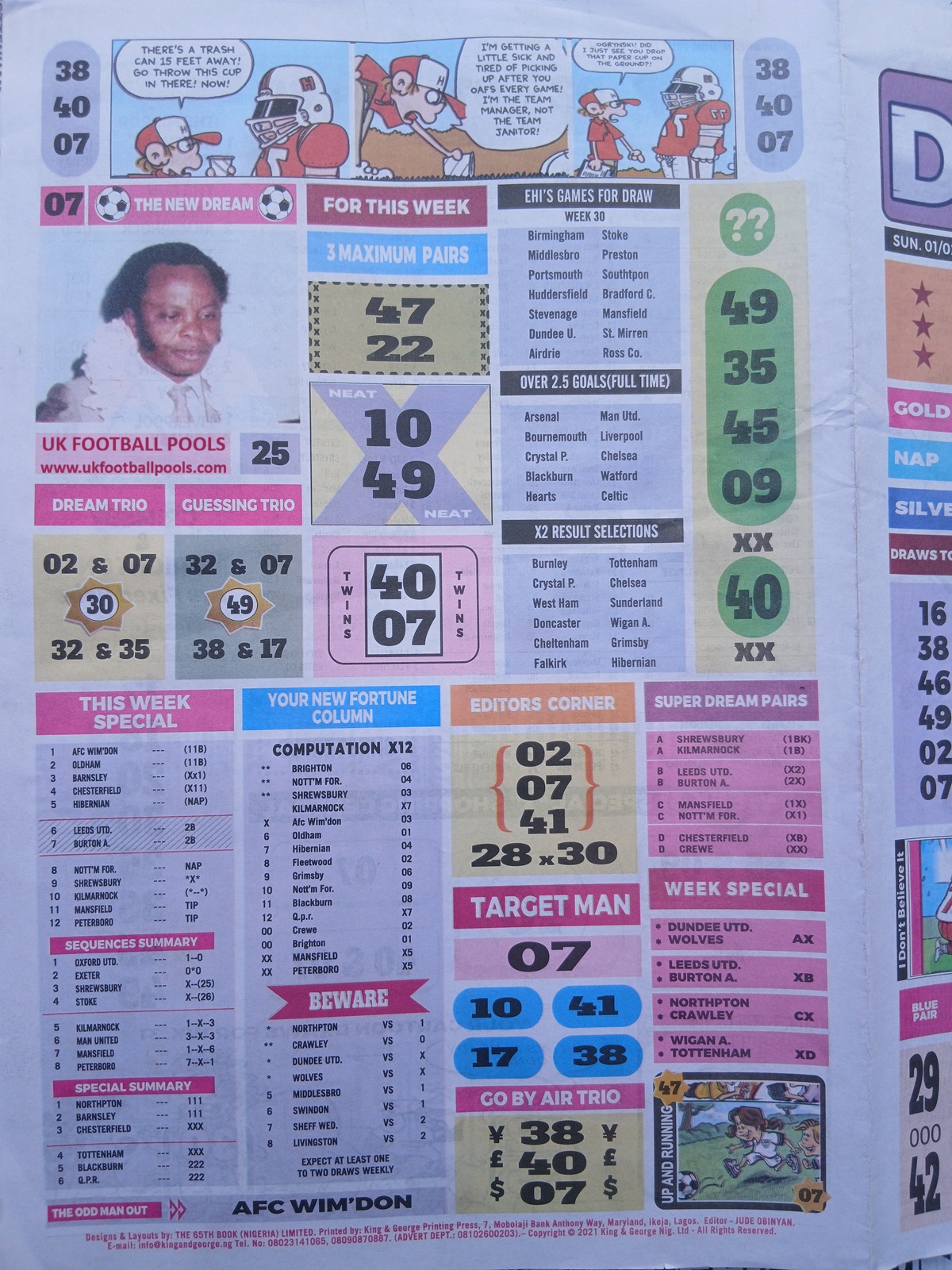 Welcome to Fortune Soccer on this section we provide other football pools forecasting papers for this week 31, such as the weekly telegraph paper, final result, the new dream late news, and other pools office forecasting papers and journals. Always refresh your browser and check back for updates inspired by pool paper association of Nigeria.